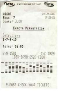 | <イギリス共通の買い方> Win:単勝 Place:複勝(4頭から7頭の場合1か2着、8頭以上の場合1から3着が当たり) Each-Way:WinとPlaceの両方に賭ける賭け方です。「5ポンドEach-Way」というと5ポンドずつという意味のようで、合計10ポンドになりますから注意。 *WinとEach-Wayについては窓口でもBookmaker(ブックメーカー)からでも買えます。窓口はWinとPlaceは2ポンドから、Each-wayは1ポンドから買えるらしいです。 ブックメーカーだと、私が見た限りではだいたいどこでも最低5ポンドから賭けられるようです。(ブックメーカーはWinかWach-wayのみ売っているようです) Exacta:連勝単式 Trifecta:3連単(1・2・3着に入る馬を順番通り当てる、8頭以上の場合に賭けられます) 他にもPlacepot/QuadpotとかJackpot、Multibetやscoop6などがあります。 |