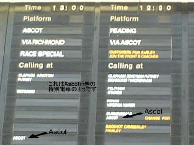 | 大きな駅なのでホームがたくさんあって、果たしてどの電車がアスコットに行くか少々分かりづらいのですが、係の人に聞いた限りでは「15番から18番ホーム」から出るようです。表示板があってそこに「Calling to〜」と書いてあるのが行き先(停車駅)ですので、その中に「Ascot」と書いてある電車を探して乗りましょう。この路線の最終は「Reading」という駅のようです。出発の間近までどのホームから出るか分かりませんが、手っ取り早いのは競馬新聞を持っている人を見つけてその人の動向を見ていてもいいかもしれません。 | ![]() |