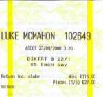 | イギリス初参戦の23日(2000年9月23日)、私は風邪をひいており最悪のコンディションでしたが、競馬場へ行きました。 買ってあったチケットでMember's Enclosureへ入りましたが、やはり高いだけあってゴール前の一番いい位置で見ることが出来ました。ゴール前は芝生で、ベンチなども置いてあり、またパドックやウイナーズサークルも行きやすく非常によかったです。ネクタイが嫌いでなければお勧めです。