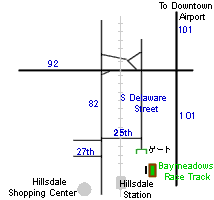| ベイメドウズ競馬場へは、車で行きました。 サンフランシスコのダウンタウンから110号線(南行き)を使い空港方面へ向かい、空港を越えてさらに南へ進みます。 次に92号線の西行きに乗り換え、すぐ出てくる「S Delaware St」で降ります。 降りて右(南)に進むと、そのまままっすぐの突き当たりが競馬場駐車場の入り口です。 ハイウェイあたりから「Expo Center Race Track」という案内が出ていますのでそれに従えば間違いないと思います。(競馬場のとなりがExpo Centerのようです) 電車・バスもあります。 まず電車の場合、Caltrainという電車のHillsdaleという駅が最寄りのようです。駅からは競馬場のスタンドが見えますが、まっすぐ歩いていく道があるかどうかがよくわかりません。アメリカはあんまり道を歩いている人がいないので歩くときはくれぐれも気をつけましょう。 バスの場合、292番のバスがダウンタウンから空港経由で競馬場近くまで走っているようです。 時刻表によれば約1時間半くらいかかるようです。(本当はもっと便利なバスがあるかもしれません・・・) |