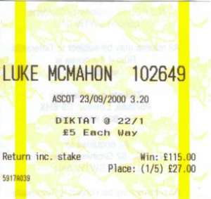 こちらは機械打ち出しの馬券。これには勝った馬の名前(DIKTAT)やオッズ(22/1)、掛け金(5ポンド・Each Way)が書かれています。