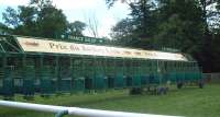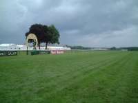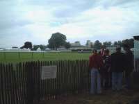 | 駅から競馬場へは徒歩で行けます。 小さな駅なのであまり迷うことはないと思いますが、駅を出てそのまままっすぐな道を行くと公園(森?)に突き当たります。公園の中の右前方にはすでに競馬場の直線コース端のラチが見えます。そちらに行けばスタンド横から入場できますし、公園のなかの道をまっすぐ進むと1・2コーナー(右回り)の間あたりに出ます。店長は後者で行きましたが、駅から10分弱で競馬場に到着しました。少し馬場の中を歩いて、ちょうどゴール板の後ろに入場券売り場があり、再度直線コースの馬場を横切ってスタンドに到着です。 どちらでもかかる時間はさほど変わらないと思います。ですのでどちらでもよろしい方をどうぞ。でも公園に人気がない場合は入らない方がいいと思います(店長が行ったときは駅から競馬場に行く人が歩いていましたので)。 右の写真は公園入り口にある案内と、コーナー脇の入り口です。(入場券売り場はさらにコースへ入き、ゴール板の裏あたりにあります) |