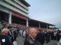 | 今日はロンドンからで1時間弱のところにあるエプソムダウンズ競馬場に行きました。 行き方は、初日はEpsom駅からバスで行くルートを取りました。ロンドンのWaterloo駅からEpsom駅まで列車で30分弱、駅を降りると駅前にバスが並んでいました。ダービーのある週末なので特別バスが駅前からたくさん出るようになっているようです。バスに乗ると10分程で競馬場正面入り口あたりに到着。目的のスタンドの入り口を探して入ります。事前に予約しておいたチケットを受け取り中へ入りました。 |