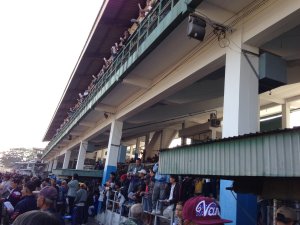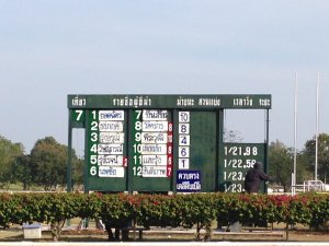 | 競馬評論家の須田さんが行ったとブログに書かれていたので、その情報を頼りに競馬場へ。 バスは特に問題もなくコラートのバスターミナルへ到着(スマホの地図で見れば大体どこにいるか分かるので降りそこねる心配もありません)。そこから競馬場へのトゥクトゥクも基本的に英語が通じて問題なし(ちなみに80バーツでした)。競馬場の画像をスマホに入れておいて正解でした。 競馬場はまさにアジアの競馬場という感じでいいですね。こういう熱気が好きです。タイの競馬お決まりのように、発走のずっと前からゲート内で馬が待ってるのが面白い。他の国だったら馬が暴れだしそうですが、こちらではおとなしくゲート内で待ってます。 馬券は単勝・複勝・馬連などなどあります。ちょっと勝っていい気分で帰りました。 |