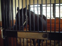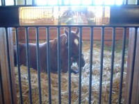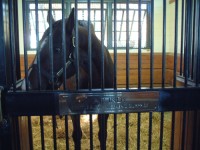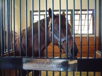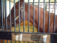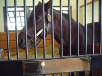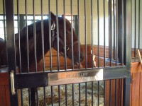| 今回のBC出張のおまけとして、今回は初めてケンタッキーの牧場を訪問して世界でも有名な種牡馬たちを見てきました。 あらかじめインターネットでいくつか調べていたのですが、結局今回はここレーンズエンドファーム(Lane's End Farm)を訪問しました。 まずは事前にネットから訪問予約を入れておきました。時間は29日の午前10時半ということで決めました。 当日は牧場の事務所の建物のあるところに寄って連絡した担当のジルさんに会いました。種牡馬のいる棟は別のところにあるとのことで、一旦車で事務所のところから道へ出て、隣の門を入りました。門は通常はロックされていて、カギか暗証番号みたいなのを入れると扉が開くようになっているようで、ジルさんの車に続いて入りました。 |