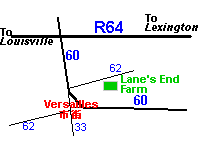 | レーンズエンドファームへは、車で行きました。 ルイビルからは東の方角へ、レキシントン方面へ向かいます。 64号線をひたすら東へ進み60号線で降ります。 降りたらその道を南(右)の方向に進むと62号線が出てきますのでそれを左に行きます。曲がったらそこからは車で3分ほどで右側に見えてきます。 |