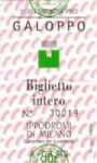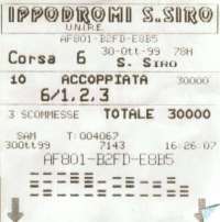 | イタリア語のプログラムの裏に書いてある「賭け方」の説明を訳しました。 (翻訳の仕事をしている、私のいとこの「Asako」さんに翻訳してもらいました。ありがとうございました。) Vincente(ヴィンチェンテ):単勝 Piazzato(ピアッツァート):複勝 4から7頭で走る場合2着以内、8頭以上の場合は3着までが当たり。 Accoppiata(アコピアータ):連勝 6頭以上走る場合、順番はこだわらない。 Scommessa Trio(スコンメッサ トリオ):決められたレースの上位3着までを当てるもの。1口の掛け金は1,000リラで、受付最低額は2,000リラ。 Scommessa Tris(スコンメッサ トリス):コルサ(レース)トリスとして指定されたレースで上位3頭を当てる。このコルサトリスはトロットやガロッポ(ギャロップ)のような違う種類の競馬でもかけられます。 Scommessa Quarte(スコンメッサ クアルテ):決められたレースの上位4頭の順番を当てるもの。1口の掛け金は1,000リラで、受付最低額は2,000リラ。 上記が賭け方の説明です。 その他書かれている説明は下記のとおりです。 賭けをする人:いつでも賭けることが出来て、次のレースはもちろん、その後のレースにもかけられます。またすべての馬券購入窓口では「ジョーコ キューソ(gioco chiuso・締め切り)」のサインが出るまで投票を受け付けています。 換金の仕方:着番が確定し、配当が発表されればすぐに、馬券は窓口で換金できます。その日のうちに換金できない場合は、馬券は8日以内であれば会計(?)で換金できる。(会計の意味が具体的によくわかりませんが・・・) 以上がプログラムにある説明の翻訳です。(イタリアの競馬場で自由自在にかけられたらなんかいい感じですね(笑)。) 競馬場のいわゆる普通の窓口と、ブックメーカーのような手書きの券を売っているところの2通りがあります。 私は言葉がわからないのでもっぱら競馬場窓口のほうで買ってましたが、試しに手書きのチケットを買ってみるのも面白いかもしれませんね。 競馬場のほうの売り場では、普通の窓口と自動販売機があります。自動販売機はアメリカの競馬場にあるようなものと同じなのですが、言葉がイタリア語なのでよくわからず、近くのおじさんに身振りで聞きながら何とか買えました。 ちなみにわかった単語は「ANNULLA=キャンセル」「ROSTO=終了」です。 他にも「ローマ」「フィレンツェ」「ニューマーケット」などがテレビ中継されてて、開催している日にはそちらの馬券も買えるようになっているようです。 |