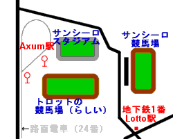 ![]() 縮尺が少々おかしな地図です。地下鉄Lotto駅よりも路面電車のAxum駅の方がかなり競馬場に近いです。Axum駅から行かれることをおすすめします。 |