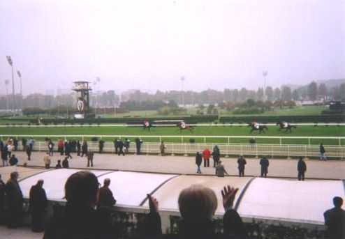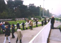 1日目、まずは少額を第1レースにと思い、軽く買って見ていました。 ところがスタートしてから気づいてしまいましたが、なんと1レースから障害レースでした。馬場の内側のコースで走っていましたが、結果はレーシングプログラムの推奨3頭がそのまま1・2・3着で、お客さんも「何だよ固いじゃねーか!」というリアクションでした(多分イタリア語でそう言ってました)。 その後、2レース以降は通常の芝のレースでしたが、結果の固いレースが続き、6レースくらいまで進みました。日本と比べてこの季節はかなり寒く、耐えられなくなって着るものを買うためにここで退散しました。が、初日は6レースでプラス102,000リラ(日本円にすると7,000円位?)でした。 |