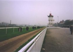 | コースはかなり横長の感じで4コーナーから直線に入ったあたりではどういう状況になっているのかまったくわからないようになっています(もちろん海外競馬場の常で「ターフビジョン」などありません)。 馬場の外側に細い通路のようなコースがあり、返し馬の際各馬はそこをとおっていきます(写真右)。 芝コースの内側には障害コースがあります。 |