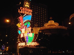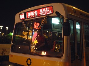 | レースも進んで6レース(午後9時半)くらいになると、観光客はすっかり帰ってしまいかなり寂しい感じに。マイアミのガルフストリームパークか、グアムのドックレース(店長の印象としては後者の方がよりイメージが近い)という感じで、ここは観光競馬場であることが判明。その証拠に、単勝と馬連の人気が明らかにかみ合っていない。 その6レース、本命を買ったらそれが当たり。逆パーフェクとは逃れることが出来ました。 8レースではティエルセで買った4頭が先行。これは組み合わせ次第では高配当?と思っていると、直線最後に関係ない馬が差してきて全滅。こんなもんかなぁ? 結局計8レースやって本命ひとつ当たったのみ。悲しい・・・。でももうこんなことにはだいぶ慣れてきたし、前半はかなり盛り上がってなかなかいい雰囲気の競馬場だったし・・・(負け惜しみ(笑))。 10レースの前にホテルに帰ることに。帰りは競馬場前から無料バスが(写真左下)。こんなところはなんとも親近感がわく。フェリーターミナル経由でリスボアホテル(写真右下)行きのバスに乗る。午後11時くらいだがフェリーは24時間運航しているそうで、フェリー乗り場でも結構人が降りる。これから香港に帰るんだろうか?そのままバスに乗っているとリスボアホテルに到着。カジノには寄らずホテルに帰りました(エラい!)。 後日談:リスボアホテルのカジノにご挨拶に行きましたが、ラスベガス式の賭けものではなく、「大小」みたいな中国風なものが主流のよう(ブラックジャックやバカラは一応ありました)で、それはそれでなかなか盛り上がっていましたが、店長はなじみがなかったので、思ったほどはエンジョイできませんでした。 |