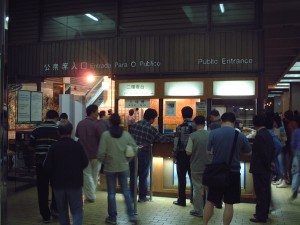 | タイパ競馬場( マカオのダウンタウンからタクシーで30香港ドル(マカオの通貨「パタカ」と香港ドルは共通で使えます)くらいで行けるそうです(と宿泊したホテルの人が言ってました)。バスもあって、店長は宿泊したホテル近くから出ている11番に乗って行きました。島への連絡橋を渡り15分ほどで到着しました。価格は3.3香港ドルとかなり安く行くことが出来ます。 帰りは競馬場前から、フェリー乗り場(香港行き)経由、リスボアホテル(カジノで有名なホテル)行きのバスがありそれに乗って帰ってきました(無料)。 フェリー乗り場前の建物や道路の形状を見ると分かるのですが、フェリー乗り場前の建物は、「マカオグランプリ」で使用されるピットです。 |