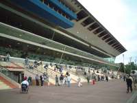 | 私、店長は2001年6月1日に行きました。昼間は全仏オープンテニス観戦を蹴って行ったオートイユ競馬場からのハシゴで、この競馬場はこの日の第二回戦目でした。 入場料は15フラン。入り口で入場料を払って入る。スタンドの中に入ってみると広いながらなかなか空調が効きそうな感じでGood。きっと気候的に寒いときもあるんでしょうね。 コースは左回りです。他の競馬場とは違ってタイヤのついたものが走るため、馬場はかなり固めに設定されており、かなり頻繁に水撒きと地ならしが行われていました。 競馬場内のスタンドはそこそこ大きめでなかなかしっかりしたつくりでした。結構儲かってるのかなぁ?などと考えてしまいました。 |