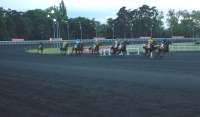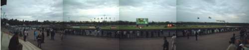 さて、レースの方は、1レースから参加。車の付いたのをひいている競走でしたがアメリカのように前に先導の車はつかず自主的に1列に並んでスタート。1回目のスタートではサイレンが鳴って、そうしたら馬たちが走るのをやめて戻って来ました。どうやらスタートがうまくいかなかったよう。再度同様の形でスタート。今度はOKのようでそのままスタートしました。 |